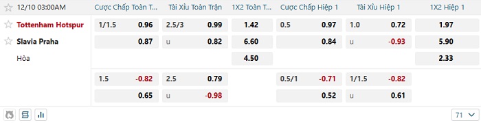 - Kèo tỷ số H1 Tottenham vs Slavia Praha: 1-0