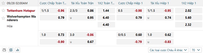 Bảng tỷ lệ kèo nhà cái Tottenham vs Wolves