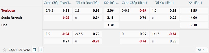 Soi kèo châu Á, kèo Toulouse vs Rennes