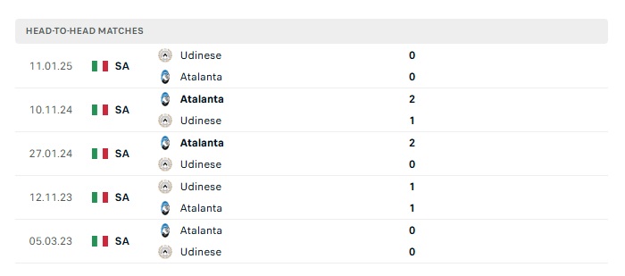 Lịch sử đối đầu Udinese vs Atalanta