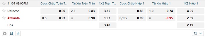 Bảng tỷ lệ kèo bóng đá hôm nay Udinese vs Atalanta