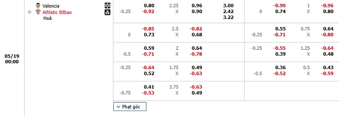 Bảng tỷ lệ kèo bóng đá Valencia vs Athletic Bilbao