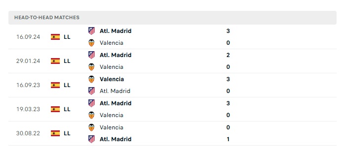 • Kèo tỷ số H2 Valencia vs Atletico Madrid: 0-2