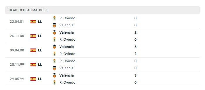 Lịch sử đối đầu Valencia vs Real Oviedo