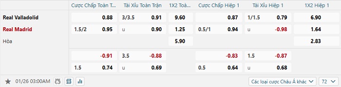 Bảng tỷ lệ kèo bóng đá Valladolid vs Real Madrid