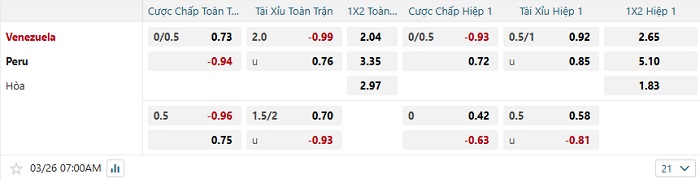 Bảng tỷ lệ kèo bóng đá Venezuela vs Peru