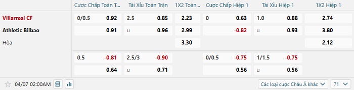 Bảng tỷ lệ kèo bóng đá hôm nay Villarreal vs Athletic Bilbao