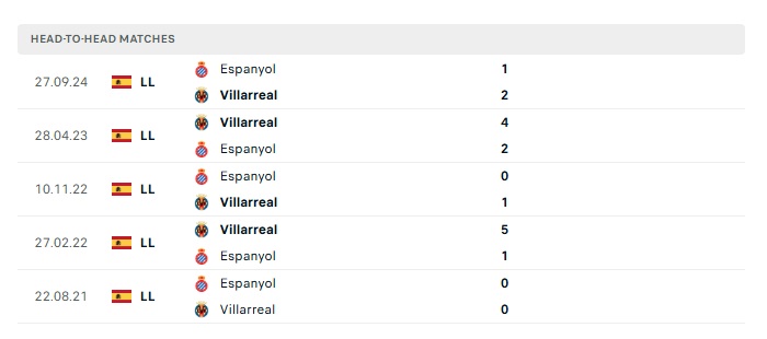 - Kèo tỷ số H2 Villarreal vs Espanyol: 2-0