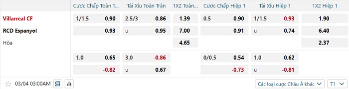 Bảng tỷ lệ kèo bóng đá Villarreal vs Espanyol