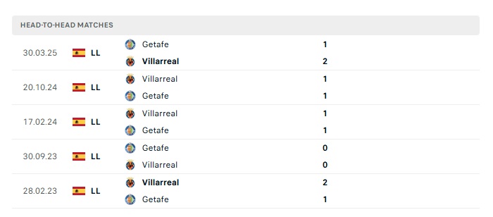 - Kèo tỷ số H2 Villarreal vs Getafe: 2-0