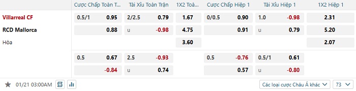 Bảng tỷ lệ kèo bóng đá Villarreal vs Mallorca