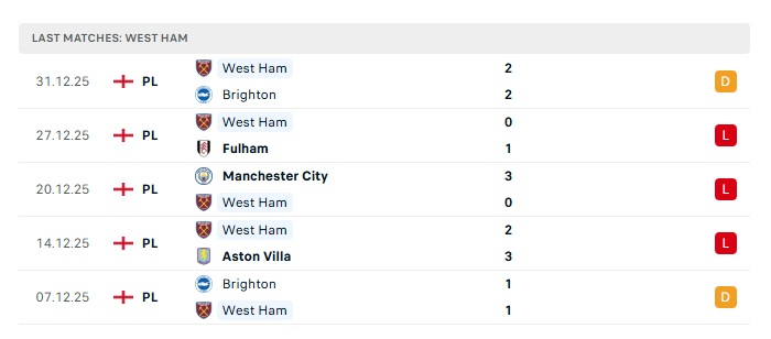 - Phong độ gần đây West Ham Utd